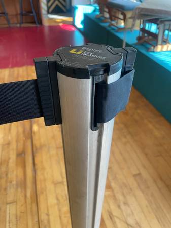 Two Beltrac Stainless Steel Stanchions with retractable nylon belts Stanchions are 41" in height and weigh approx. 30 Lbs each Nylon belts extend up to 7 feet and slot into each other's post....
