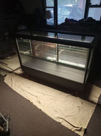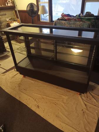 I bought a 1940's Glass display case that was Duck Taped together. Amazing that it made it back to the house. Solid Oak Bottom and Back Frame. I added wood trim to the front sides and top incasing the glass top. New LED Light, Caster Wheels and Painted it Satin Black. Very heavy. $800