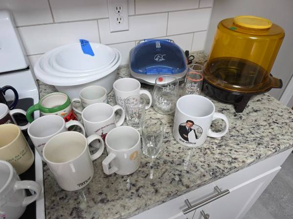 This is a huge lot of kitchen stuff! Start your own restaurant! Furnish an apartment or vacation home! Give 'em away as Christmas gifts! All of this stuff is out of some former AirBnb's - what you see is what you get. There are about 3 totes full of stuff. Dishes, bowls, silverware, drinking glasses, wine glasses, cooking pots and pans, cooking utensils, glassware, blenders, toasters, canister sets and more. Let me know if you have questions.