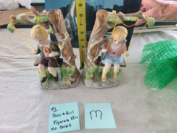 A boy and girl on a swing, the figurines are 8 1/2 inches tall. They are in great condition with no chips.