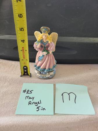 5 inch tall figurine of an Angel with a flowing dress, and the word May at the bottom of the statue. The statue is in good condition without any chips.
