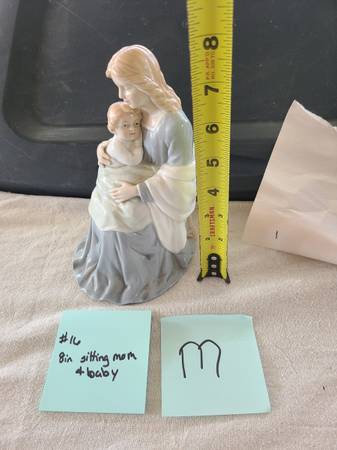 This is a statue of a Mother holding her baby in a seated position. The statue is 8 inches tall and appox 3 inches wide. The statue is in great condition with no chips.