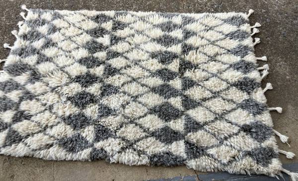 Gray and White 100% wool rug. Barely used. Sheds fibers. Very thick. Soft and comfy on the feet. Purchased for ~$175 new. 4 foot by 6 foot