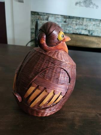 This Wicker Duck has a wooden neck, wooden bill, wooden tail and wooden feet. It is very well constructed, tightly woven wicker, with beautiful detailing. Excellent, like new condition.
