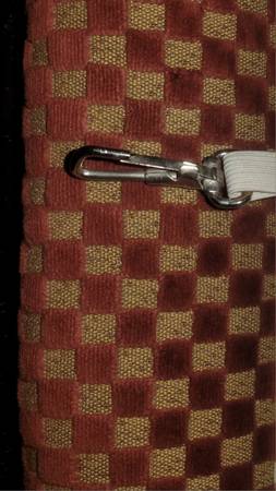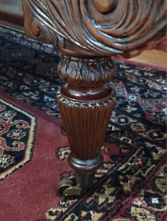 This Burgundy/Baige Colored Hickory White Savanna Sofa features a solid mahogany wood frame, rolled armrests with mahogany carved detailing on fronts, mahogany turned carved legs with front castors. Seat cushions can be secured in place with metal tabs. Like New, Excellent Condition. Well Constructed, very sturdy.