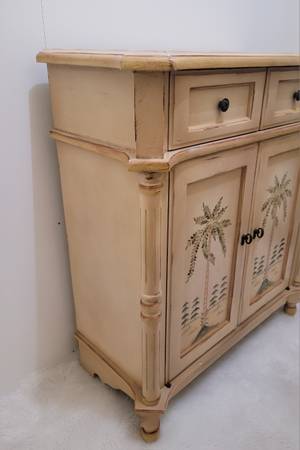 Palm Tree Cabinet Features: Two doors with palm trees, shelf behind doors for storage, two drawers for added storage. Antique cream color. Excellent Condition.