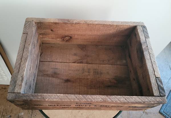 This is a antique wood crate from The Milford Rivet & Machine Co. in Milford, Connecticut.