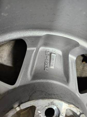 (5) five stock TJ/LJ Rubicon wheels. These are the OEM wheels, not aftermarket reproductions. All five are in good shape, have the Jeep logo center caps, and some minor imperfections such as paint chips.